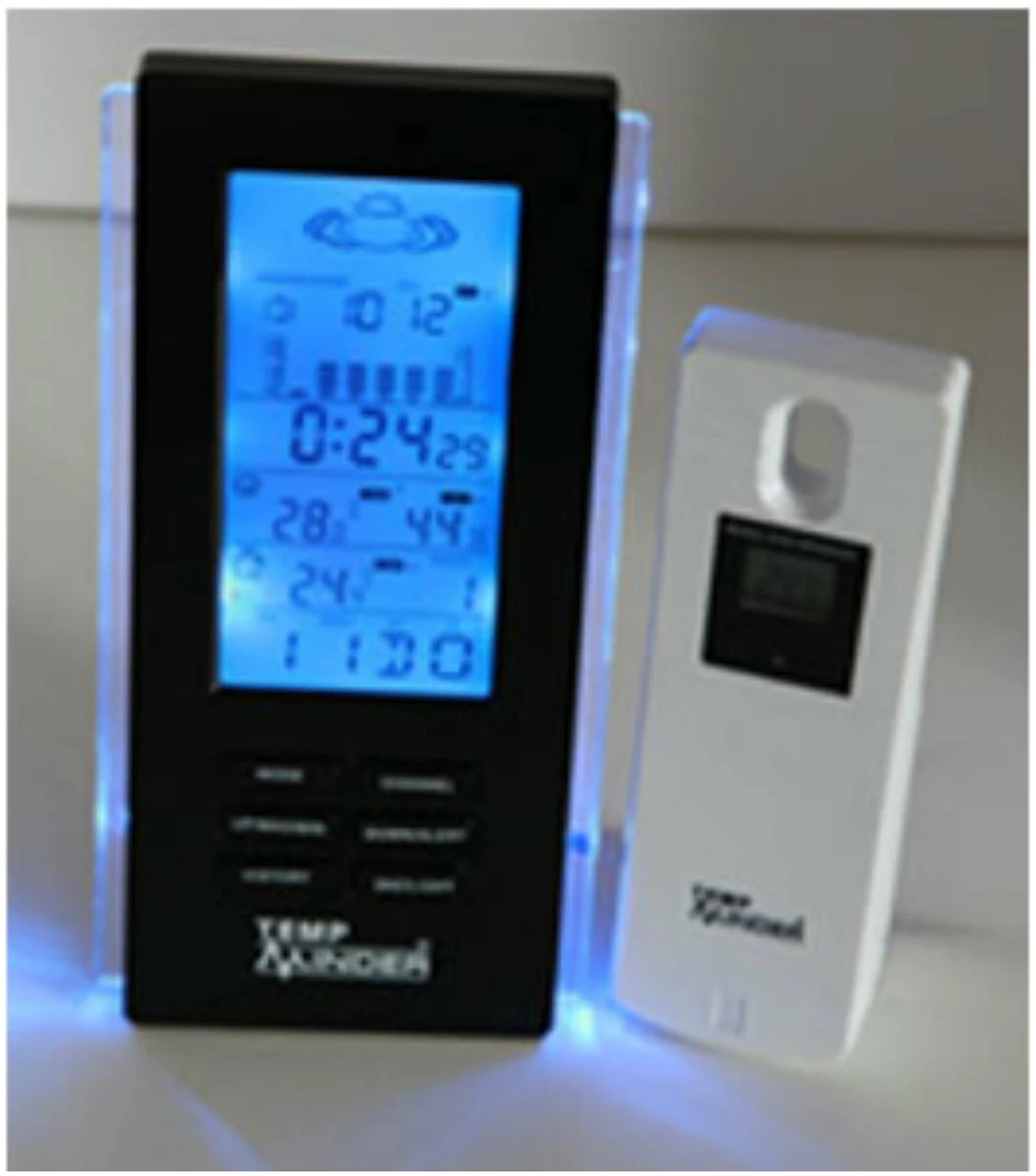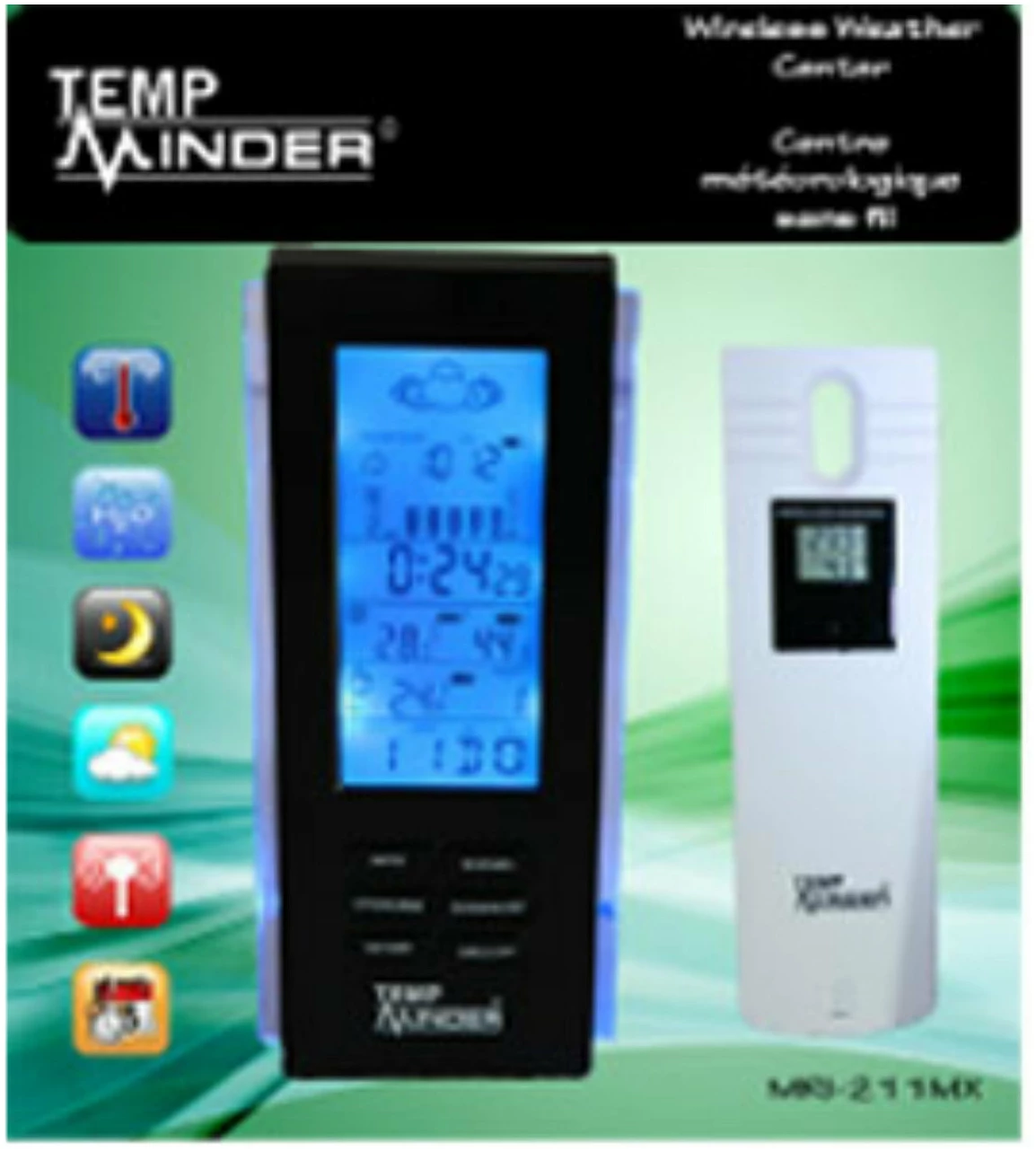 Wireless Weather Center (MRI-211MX) -Easy to read LCD display with ultra blue LED back-light – Indoor thermometer and hygrometer °C or selectable – Outdoor temperature range -22°F to 140°F (-30ºC to +60ºC) – Electronic weather forecast (12 to 24 hours in advance) – Min/Max temperature record and High/Low alerts – Alarm clock with snooze, 12/24 hour selectable – Calendar and day of week in seven languages – Moon phase display – Transmission distance 210 feet (65 meters) Transmitter Information RS-MX (RS-211, RS-213 – Wireless Remote Sensor) – Requires 2 “AAA” batteries (not included) – Temp range -22°F to 140°F (-30°C – 70°C)